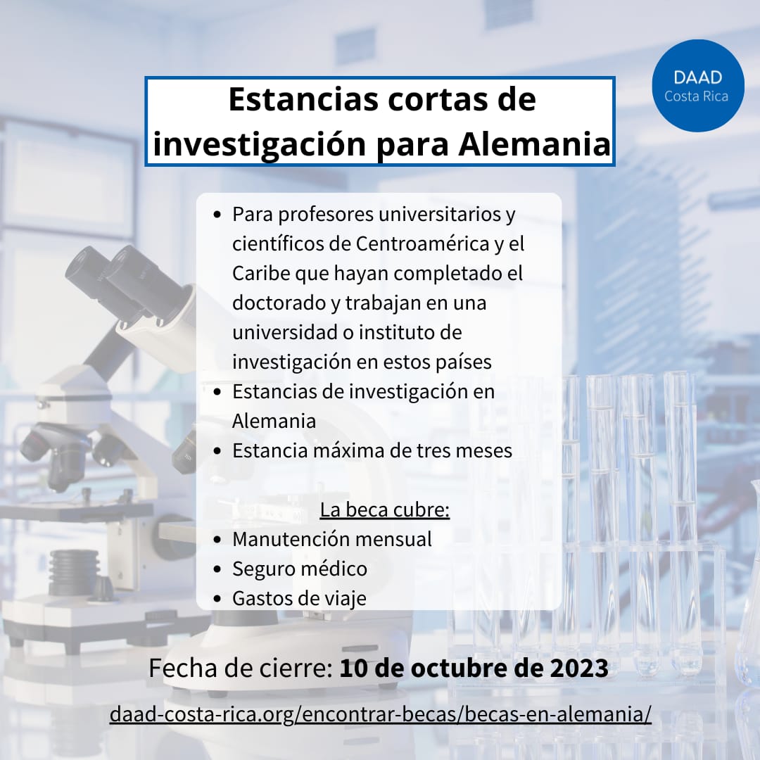 Becas de Investigación- DAAD Categoria Doctorado y Postdoctorado Investigación País Alemania Fecha de Inicio de Convocatoria Mar, 01/08/2023 - 08:00 Fecha de Fin de Convocatoria Mar, 10/10/2023 - 18:00 Página Oficial de la Beca https://www.daad-costa-rica.org/es/encontrar-becas/becas-en-alemania/ Página Oficial de la Beca https://www.daad-costa-rica.org/es/encontrar-becas/becas-en-alemania/