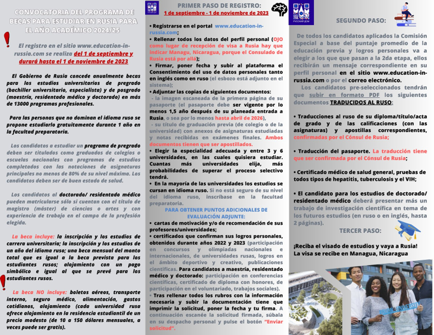 La Casa Rusa en Nicaragua está anunciando una convocatoria de becas para estudiar en Rusia en el ciclo lectivo 2024/25 a través de su sitio web www.education-in-russia.com a partir del 1 de septiembre de 2023. Esta convocatoria ofrece la oportunidad de estudiar carreras de grado, posgrado y doctorado en Rusia. Aquí están algunos detalles clave: