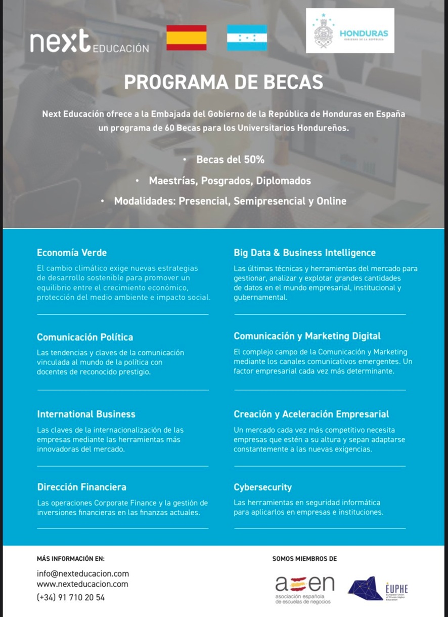 Next Educación, y la escuela universitaria de negocios, complace en anunciar un Programa Especial de Becas en colaboración con la Embajada de Honduras en España. Esta iniciativa tiene como objetivo apoyar a los estudiantes hondureños más destacados, brindándoles la oportunidad de ampliar su carrera profesional con un 50% de descuento en todas nuestras maestrías, ya sean de modalidad presencial, semipresencial u online.